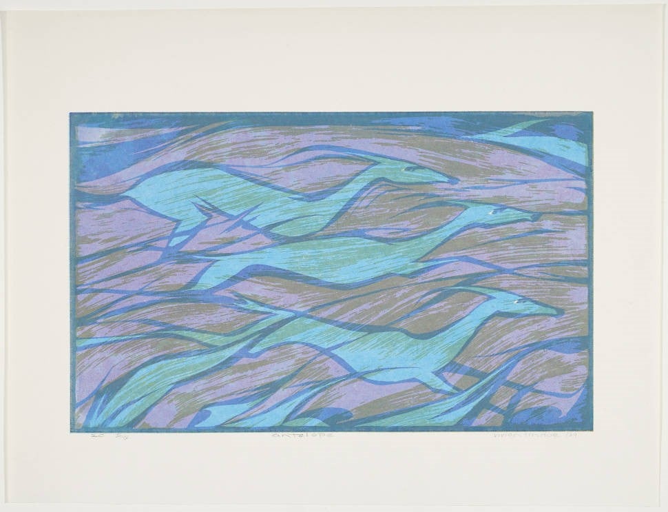 Around 1966, Vivian Lindoe built a home in Salmon Arm, on a hill that overlooked Shuswap Lake, and she lived there until the mid 1990s. Soon after moving to Salmon Arm, she began work on an important series of prints, experimenting with silk-screening. In the 1970s she was increasingly known as a printmaker, and in 1972, Calgary Galleries held an exhibition of her serigraphs. In an artist statement for that exhibition, she spoke about her interest in nature, noting that “At present I am living in the interior of B.C. on an acreage teeming with life. Bear, deer, pheasants, gophers, and insects help eat the garden, and all the elements have a direct bearing on survival, or ease of survival.” [9] She would continue to work in printmaking throughout the 1970s, exploring subjects such as animals, trees, and dancers and continuing to emphasize movement and organic forms in her compositions; in 1977, she held an exhibition of her silkscreens in Salmon Arm.