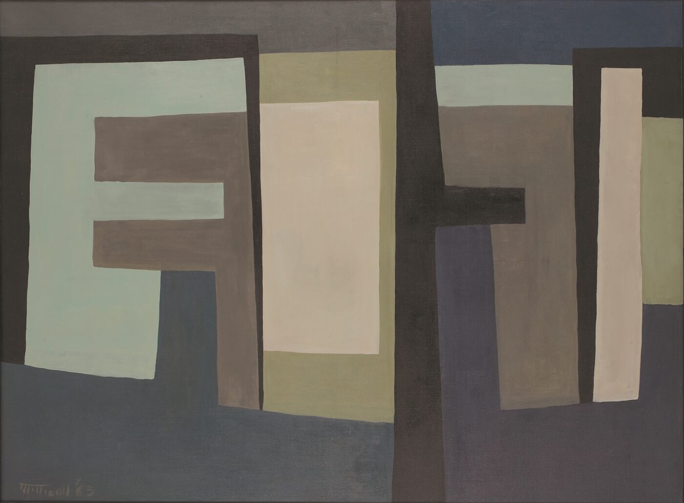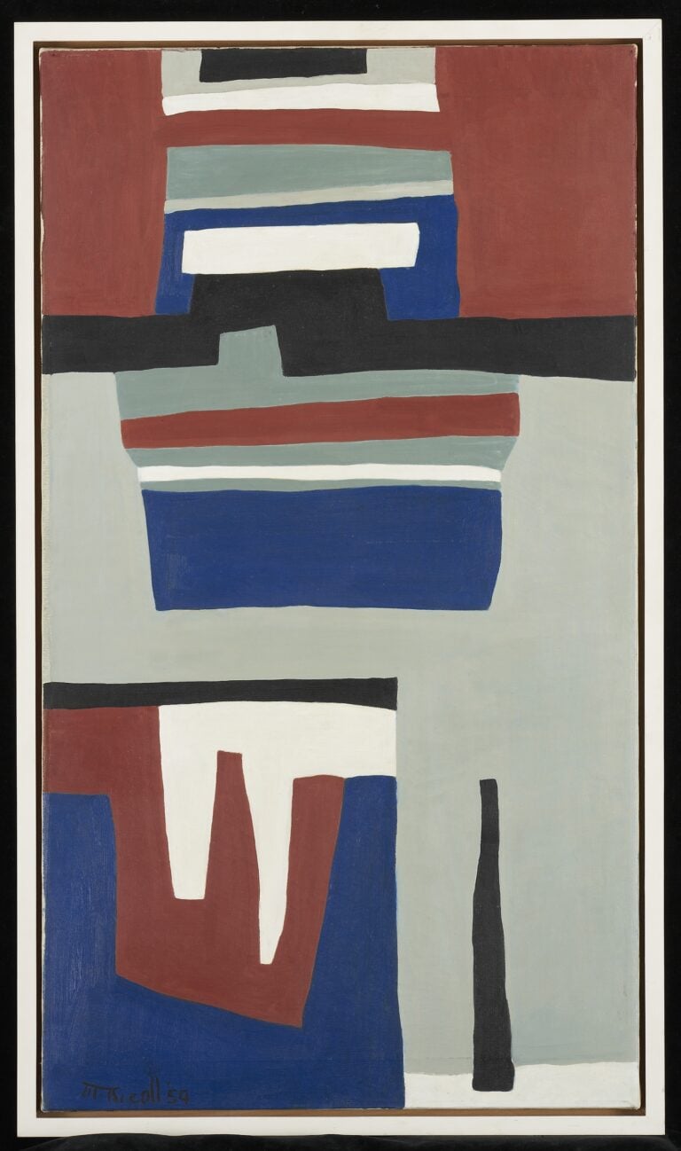 Nicoll’s automatic works became pivotal to her future painting: reflecting on her art with John Hall and Ron Moppett, she said the automatic works “gave me assurance. I’m absolutely sure now that I have a place on which I stand, from which I can paint.”[2] From this foundation, a turning point occurred when she attended a summer art workshop at Emma Lake in Saskatchewan in 1957. The workshop was led by American artist Will Barnet, and the intention had been to focus on printmaking — but when the printmaking equipment did not arrive, Barnet set up exercises in painting instead. While studying the model, Nicoll began creating increasingly abstract compositions. Looking back on the workshop, Nicoll remembered, “there was something electric.… The whole place just quivered.… And I just took off!”[3] Inspired by this new direction in her work, she arranged to take leave from teaching at the Institute and she and her husband, artist Jim Nicoll, travelled to New York in 1958 for several months of studying and painting. During their visit, Nicoll received a Canada Council grant, and this enabled them to travel to Europe for further creative research before they returned to Calgary. By the time they arrived home in 1959, Nicoll had committed herself to what she called “classical abstractions”: abstract paintings defined by crisp lines, flattened planes of colour, and no recognizable subjects — but were still grounded in Nicoll’s experiences. She presented her first major paintings in a solo exhibition in 1959.