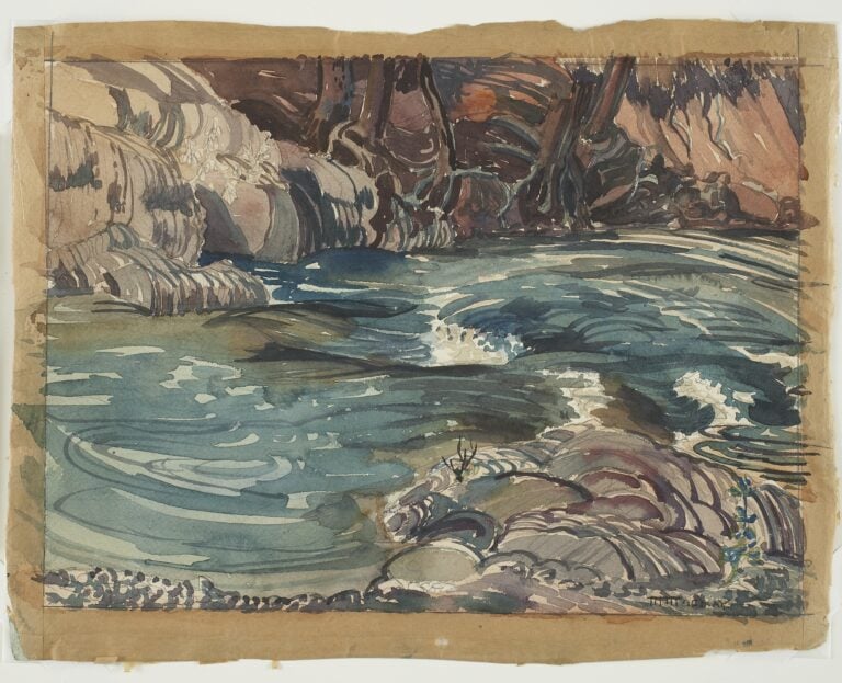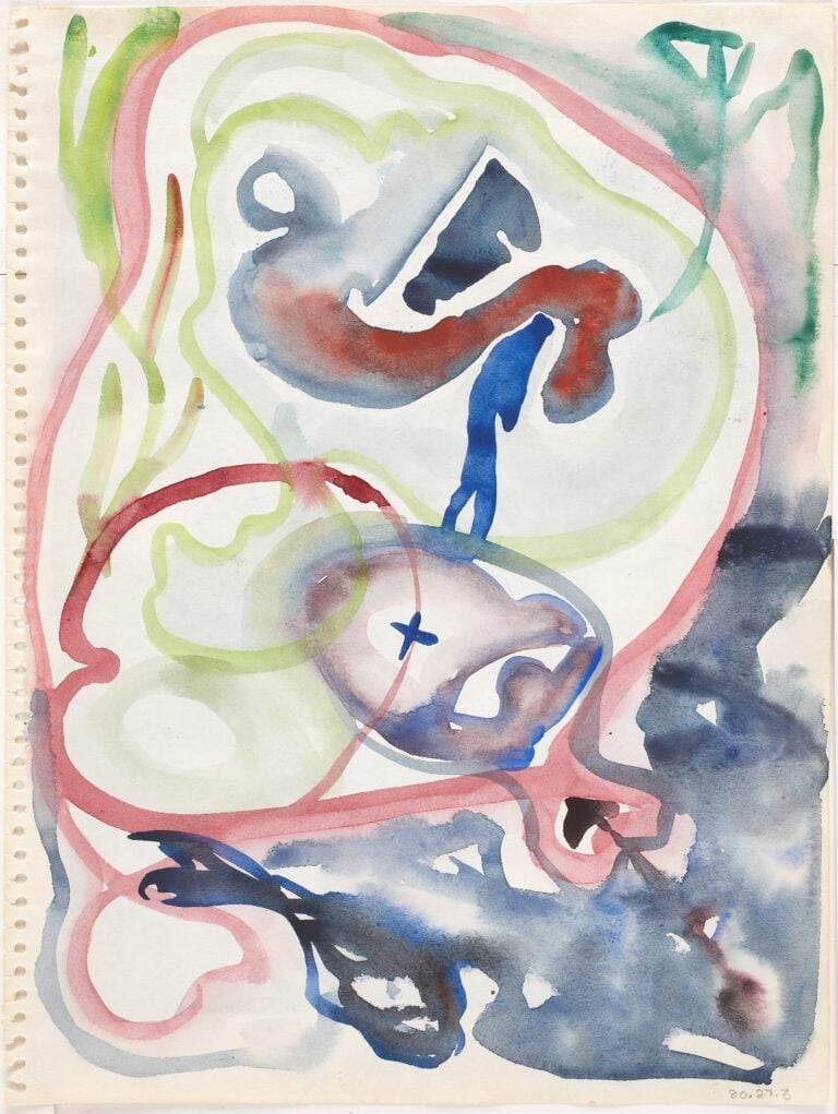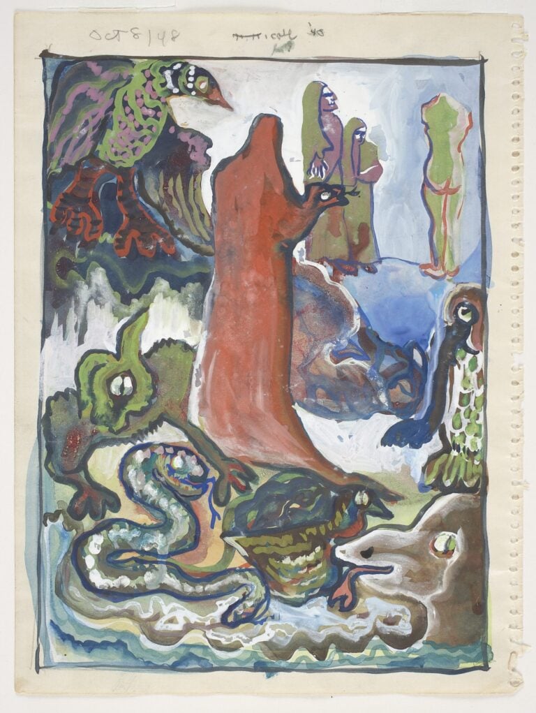 In her early career, Nicoll painted numerous landscapes, working in oil and watercolour. She was interested in Modernist approaches to Canadian landscape and admired Emily Carr’s landscapes depicting British Columbia. In the late 1940s, however, Nicoll’s practice changed dramatically. From 1946 to 1947, she taught with Jock Macdonald at the Banff School of Fine Arts and the Provincial Institute of Technology and Art, and he introduced her to automatic drawing and watercolour. In the automatic technique, the artist holds a pencil or paintbrush above a paper and allows their hand to move without conscious thought, such that the image created comes from the subconscious mind. For Nicoll, automatic artmaking was transformative. She found it powerfully inspiring and restorative, and was surprised by the works she made. Discussing her process, she stated, “It was an inside source that you gathered from outside and it was at your subconscious level and the automatic drawing brought it out.…nothing that you’ve seen or touched or smelt is lost, it’s all sorted in the subconscious…I did things that really shocked me.”[1] Nicoll created dozens of automatics, filling sketchbooks with automatic drawings and using watercolour for automatic paintings.